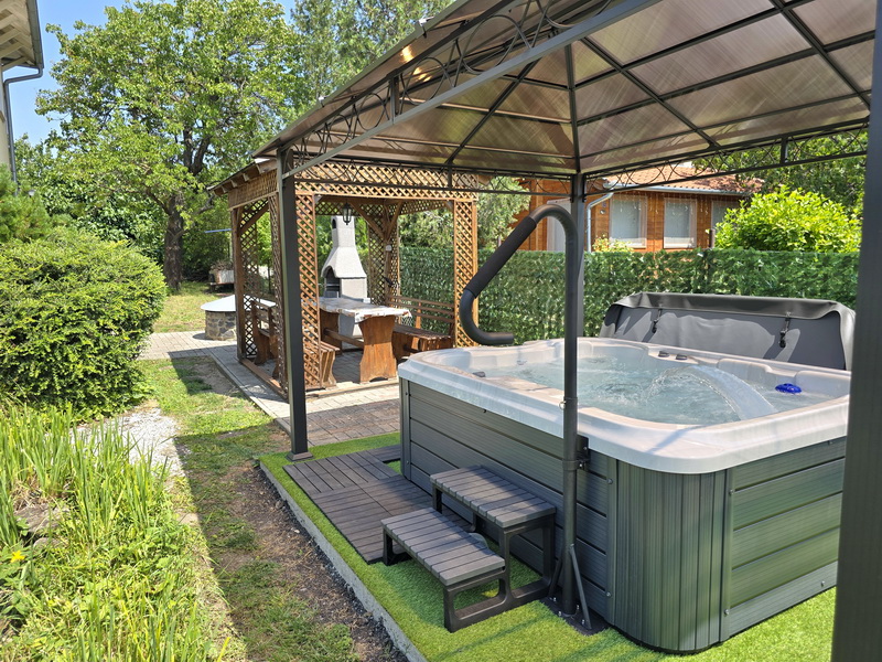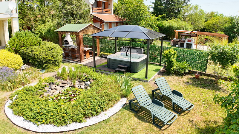 Der gepflegte, geschlossene Garten mit Zierteich, vielen blühenden Sträuchern, Jacuzzi und gemütlichem Grillbereich sorgt für eine besonders entspannte Urlaubsatmosphäre. 🌺