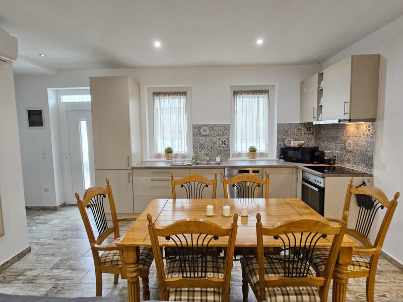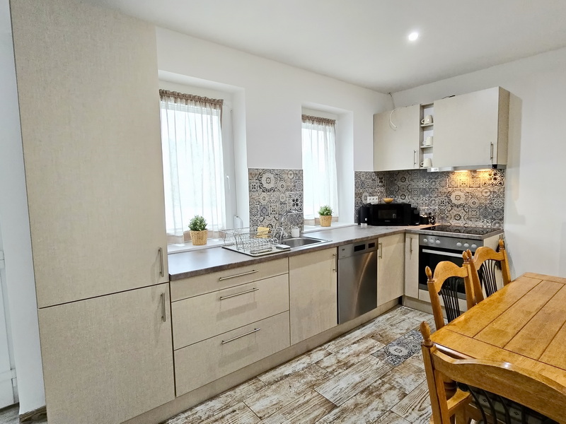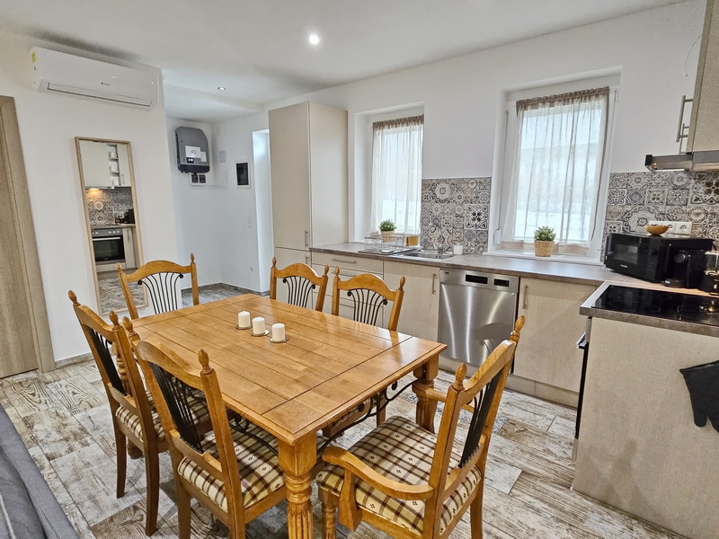 A konyha mosogatógéppel és nagy, 6 személyes étkezőasztallal rendelkezik, a nappali és az étkező pedig egy légtérben található.