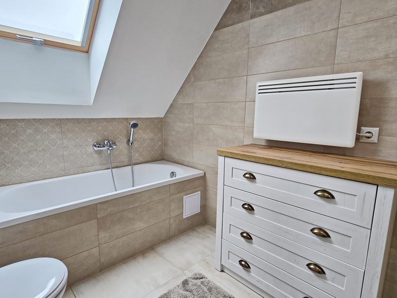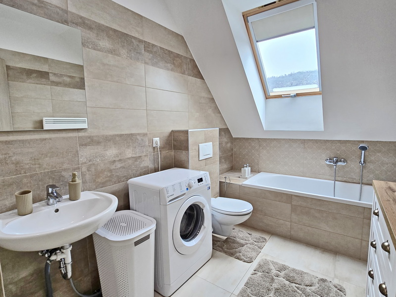 A két szintet belső lépcső köti össze, amely kissé meredekebb kialakítású, ezért kisebb gyermekekkel érdemes fokozottan figyelni.